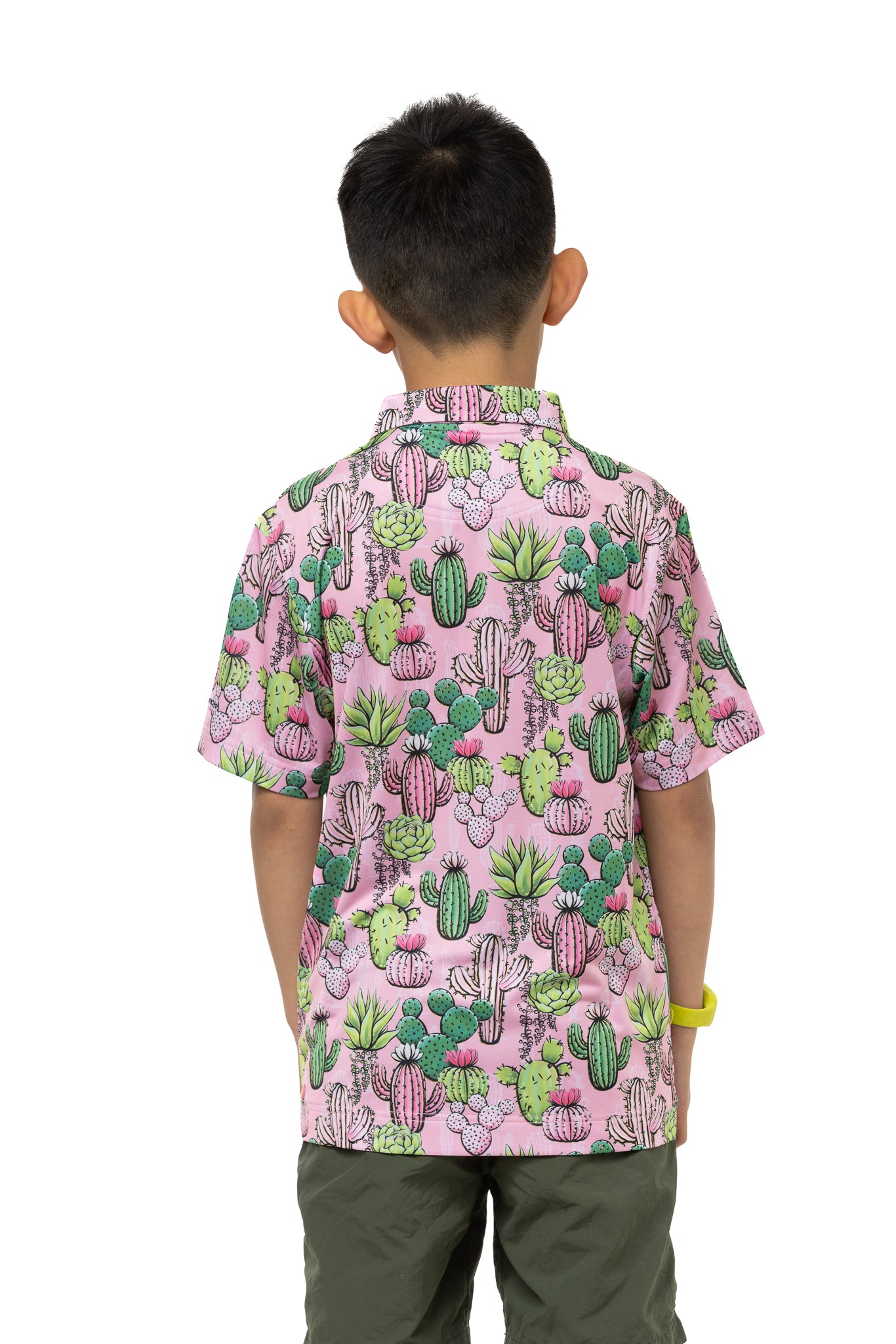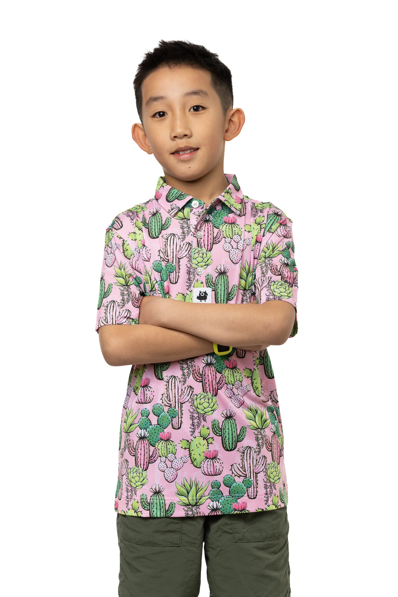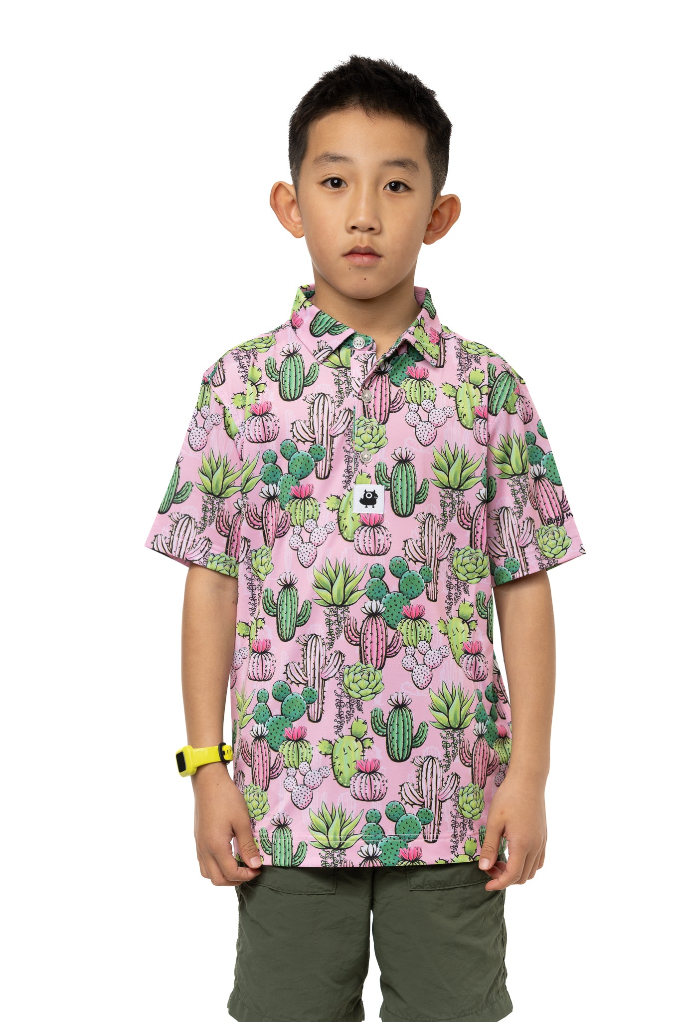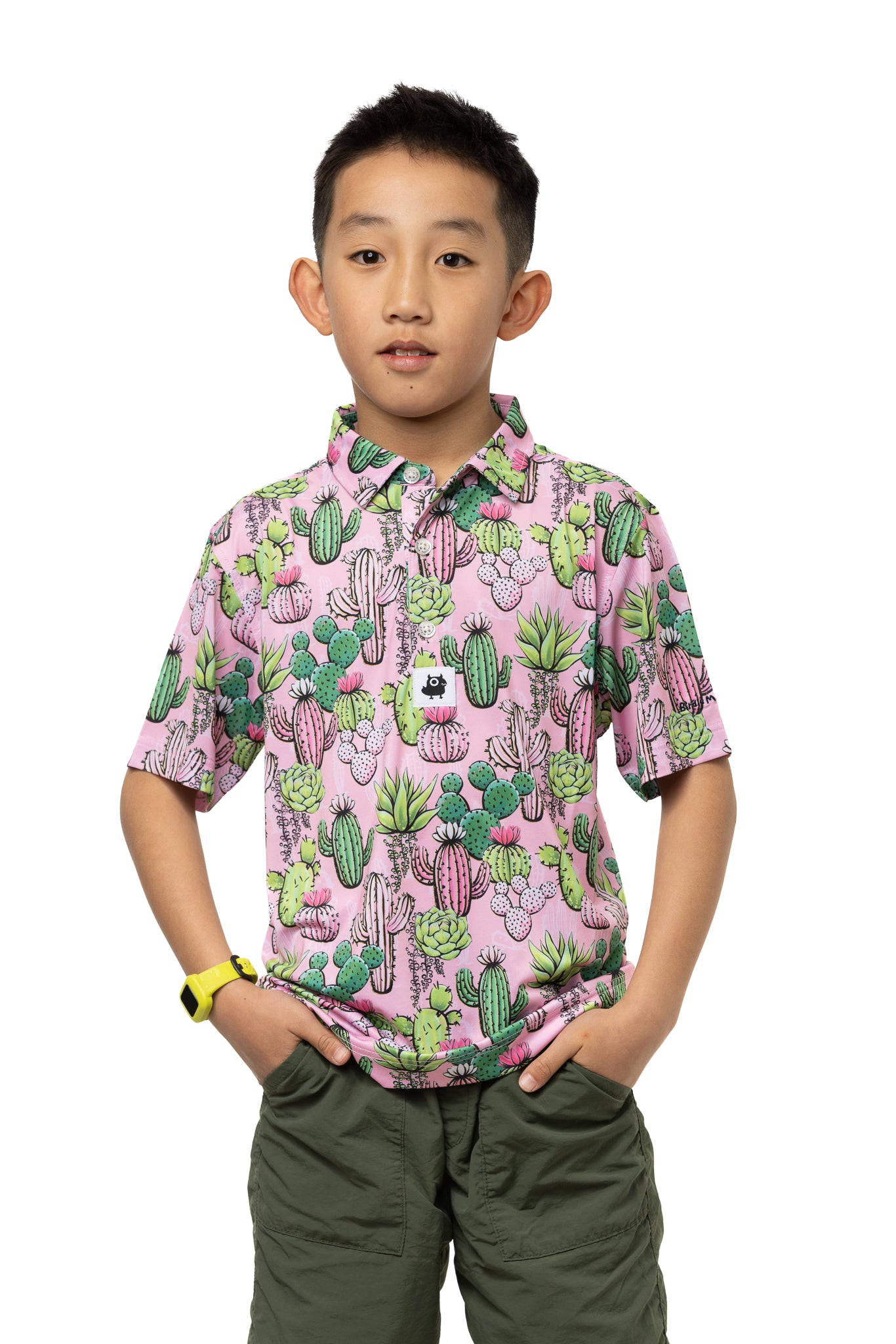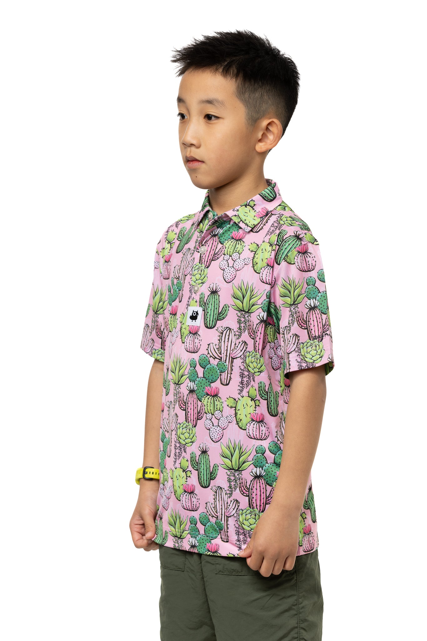 The Birdie Monster Cactus Frenzy Kids' Golf Polo is a vibrant and playful option for young golfers. Made from polyester and spandex, this shirt is both comfortable and durable. The quick-drying technology makes it ideal for hot weather, and the full range of motion allows for easy movement on the course. The many different coloured cactus on the pink background add a touch of fun and excitement to your child's golf attire. With a three-button placket, collared neckline, and tailored cut, this golf polo is both functional and fashionable.