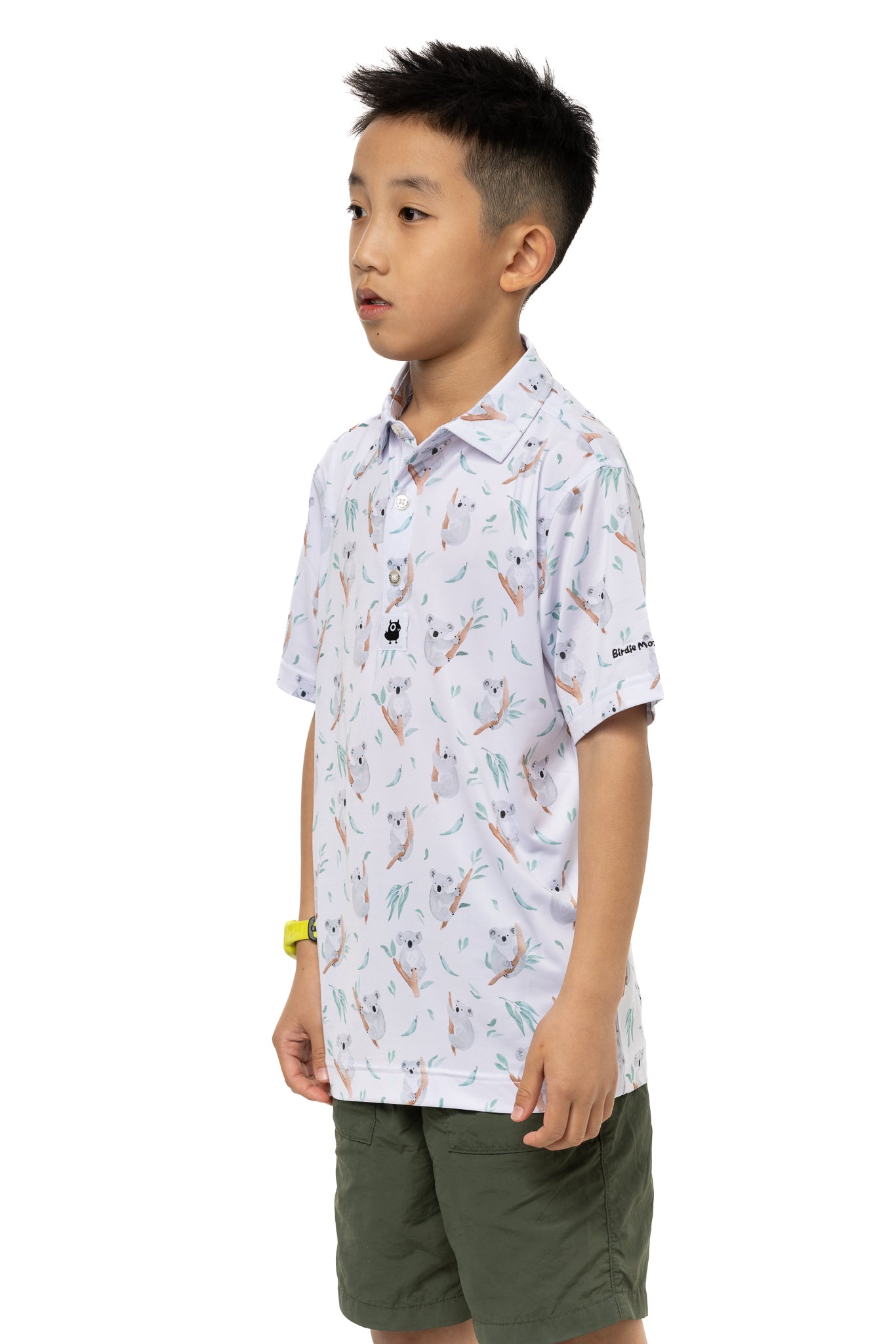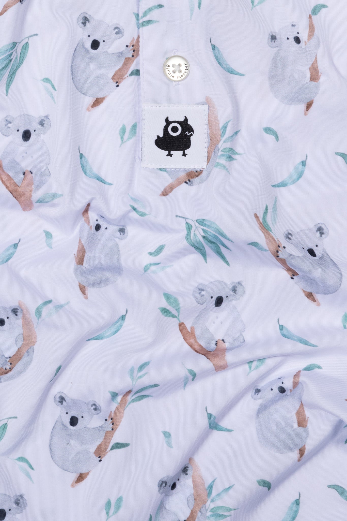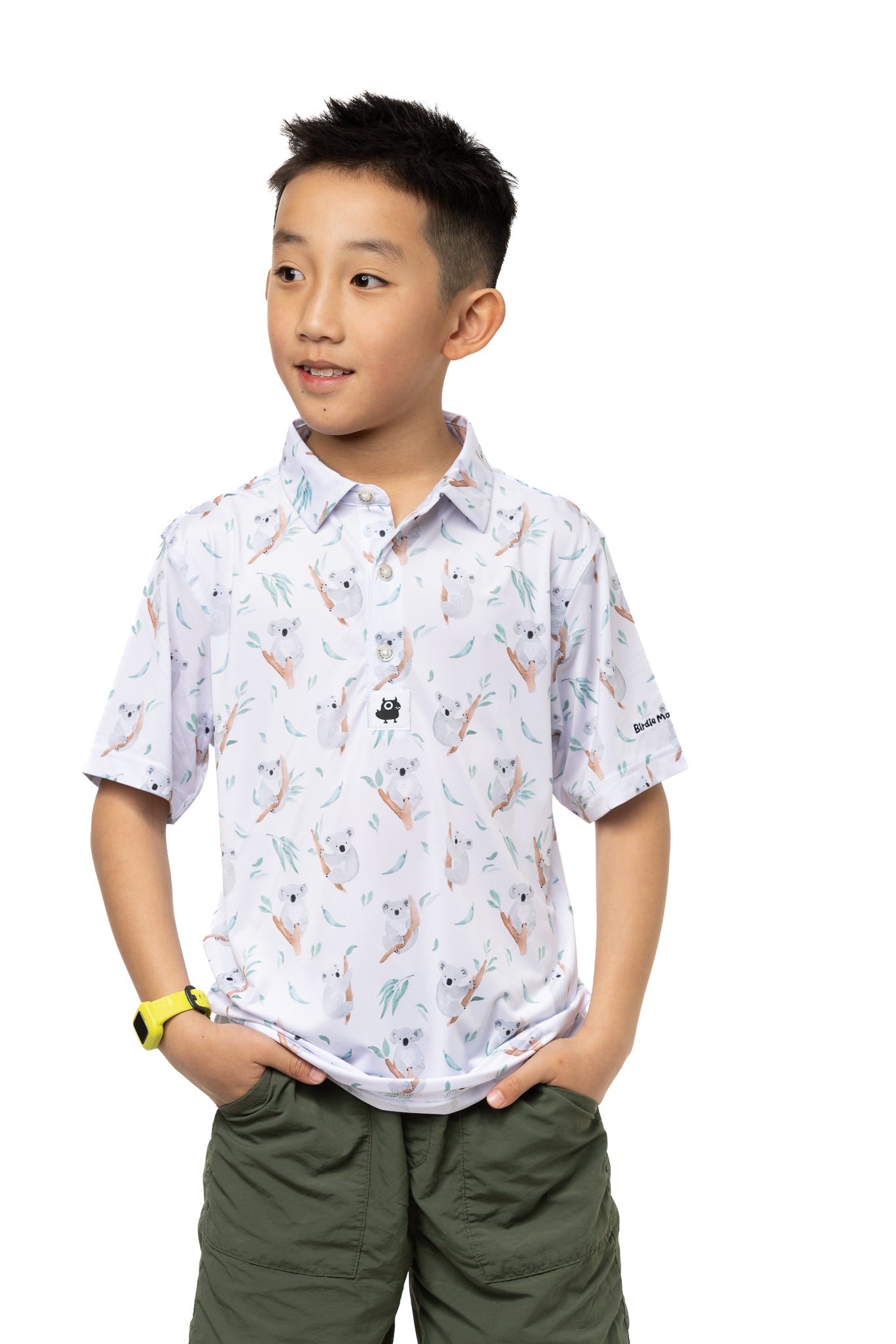 The Birdie Monster Pretty Boy Kids' Golf Polo is a playful and fun option for young golfers. Made from polyester and spandex, this shirt is both comfortable and durable. The quick-drying technology makes it ideal for hot weather, and the full range of motion allows for easy movement on the course. The many cute koalas on the white background add a touch of joy and excitement to your child's golf attire. With a three-button placket, collared neckline, and tailored cut, this golf polo is both functional and fashionable.