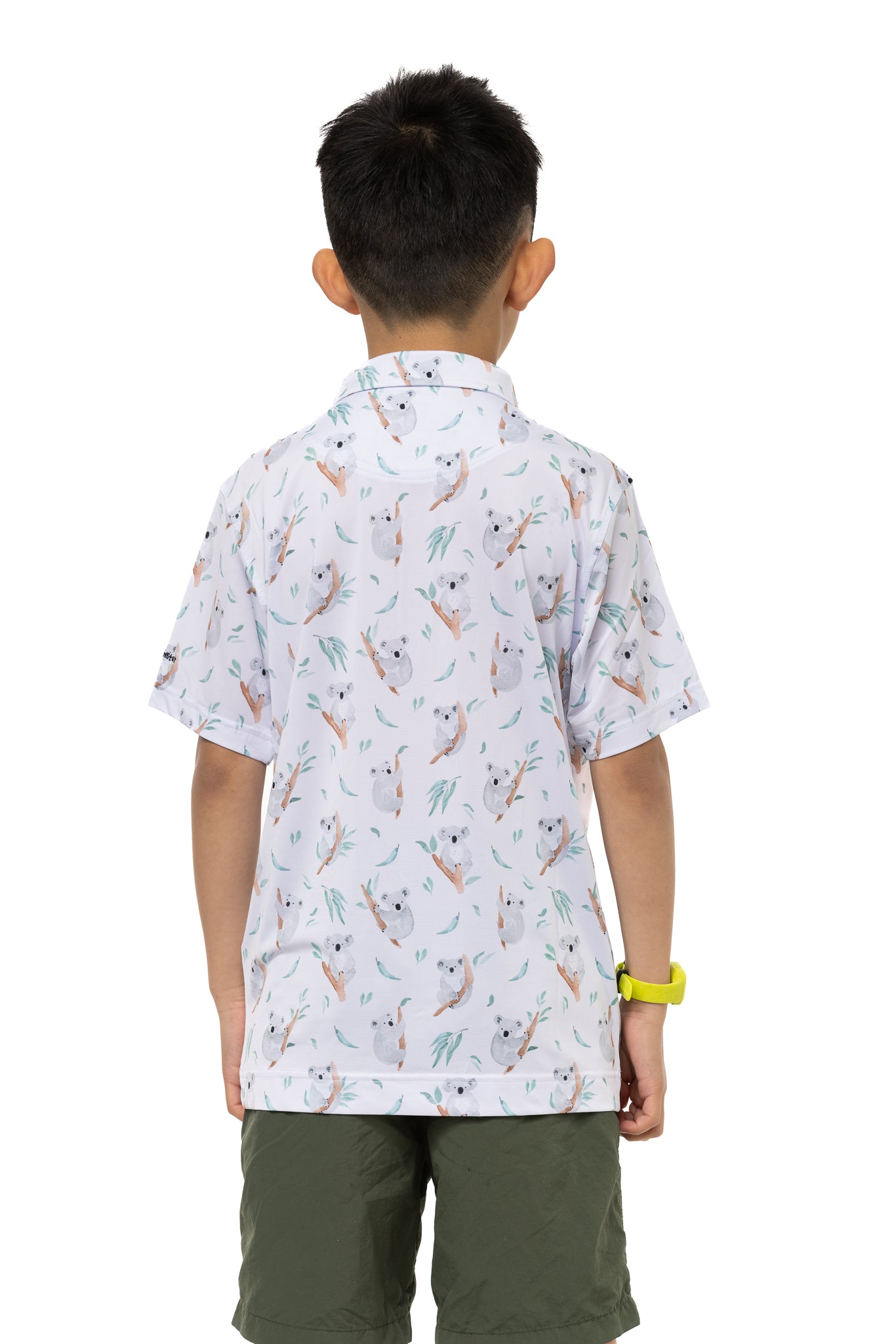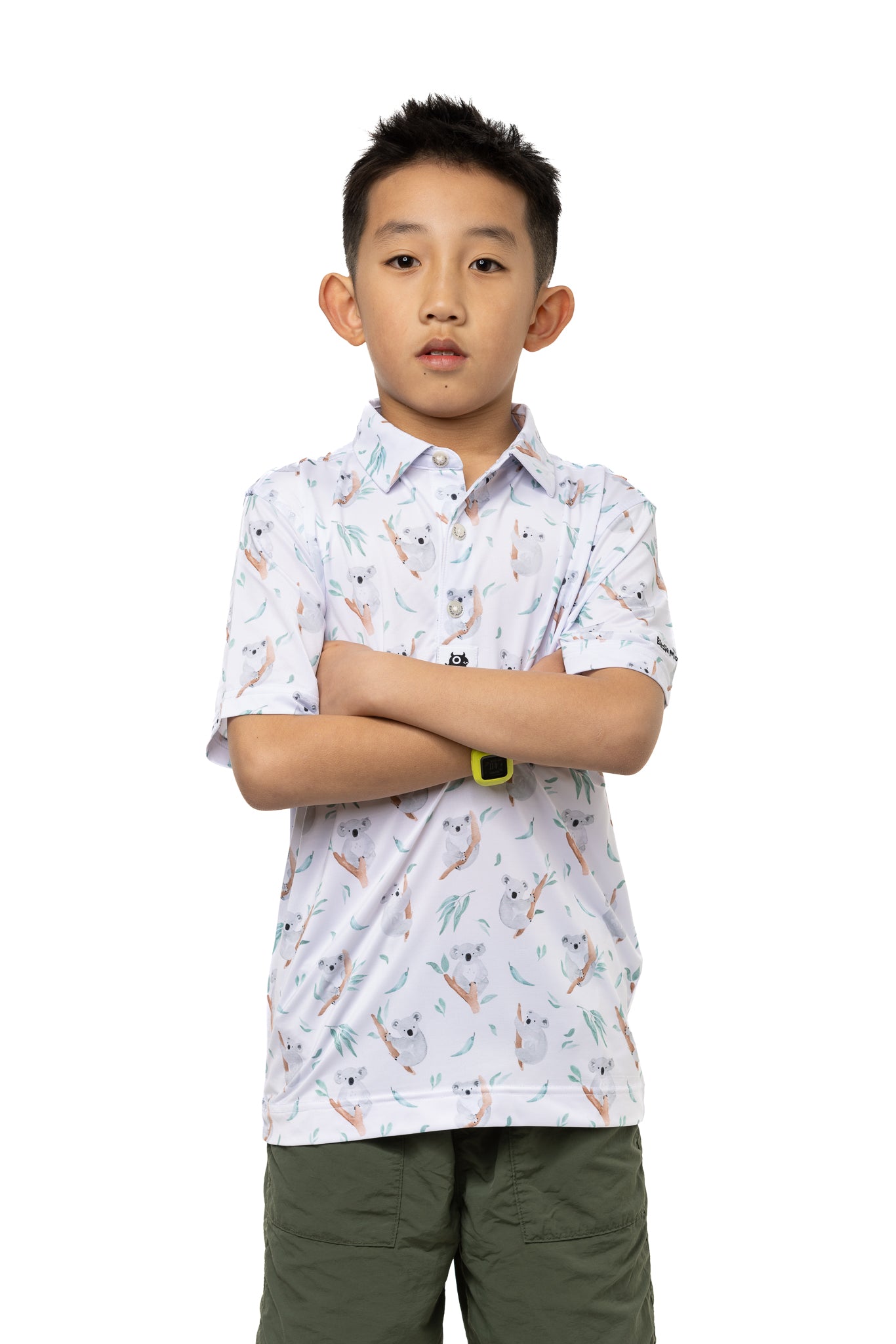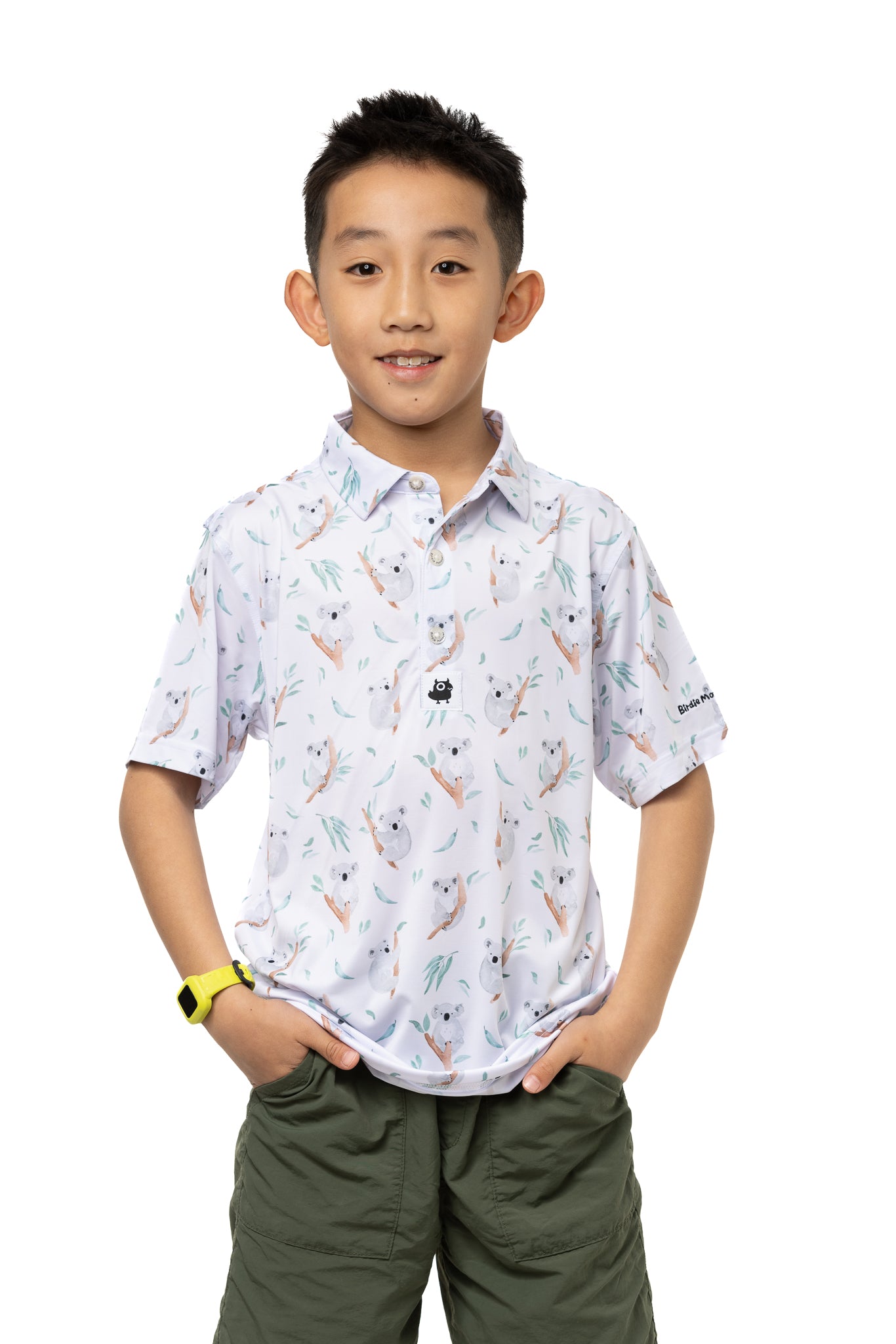 The Birdie Monster Pretty Boy Kids' Golf Polo is a playful and fun option for young golfers. Made from polyester and spandex, this shirt is both comfortable and durable. The quick-drying technology makes it ideal for hot weather, and the full range of motion allows for easy movement on the course. The many cute koalas on the white background add a touch of joy and excitement to your child's golf attire. With a three-button placket, collared neckline, and tailored cut, this golf polo is both functional and fashionable.
