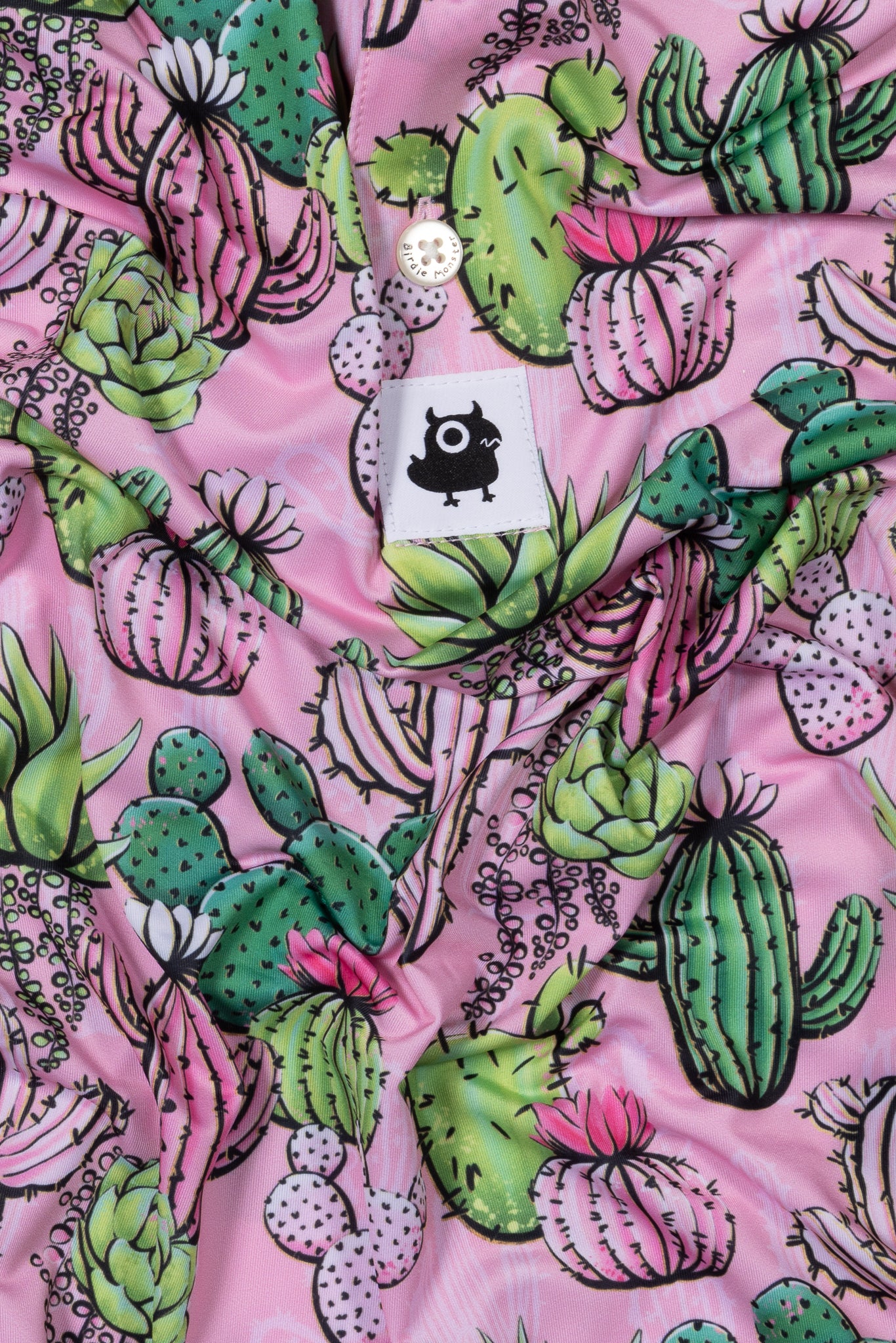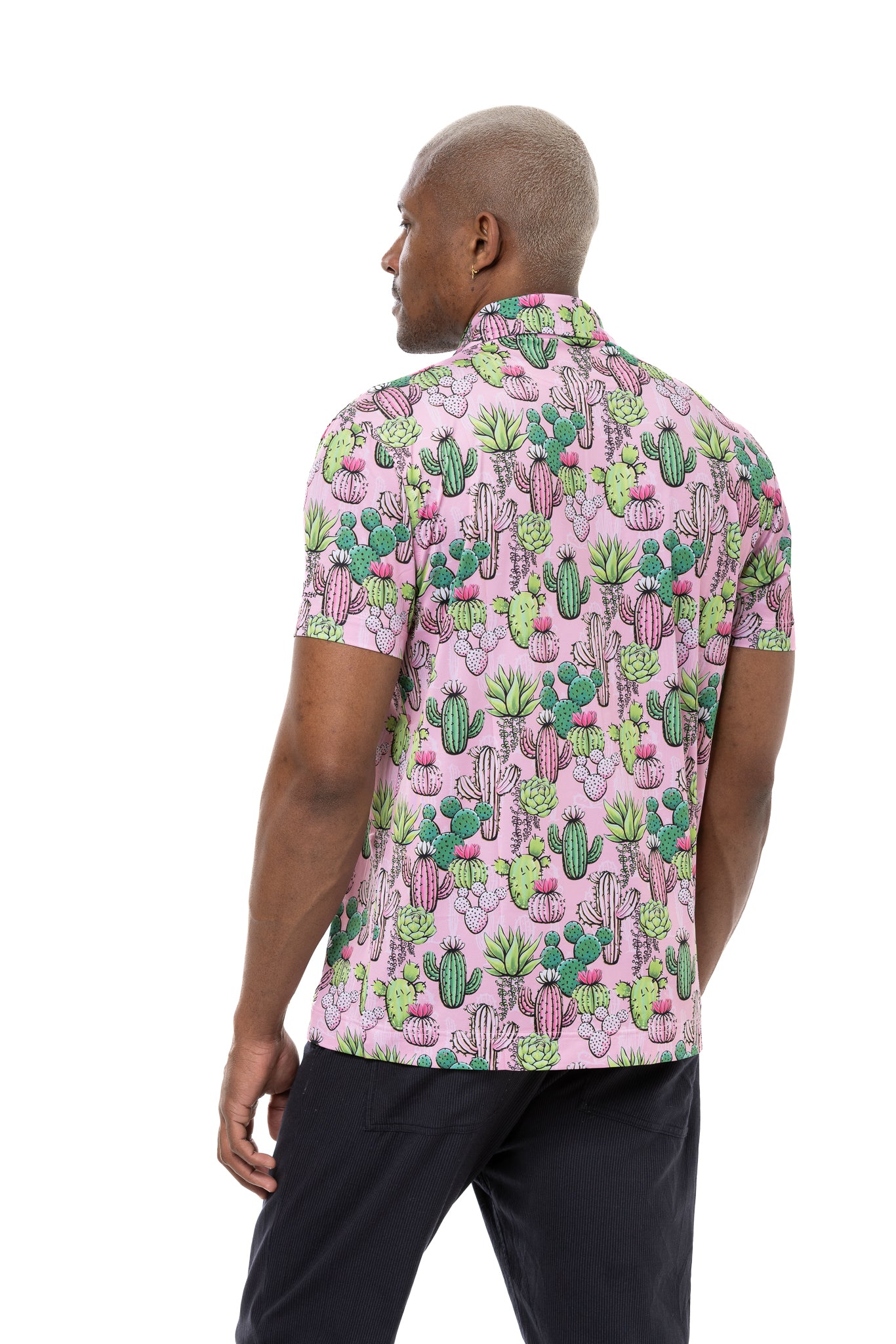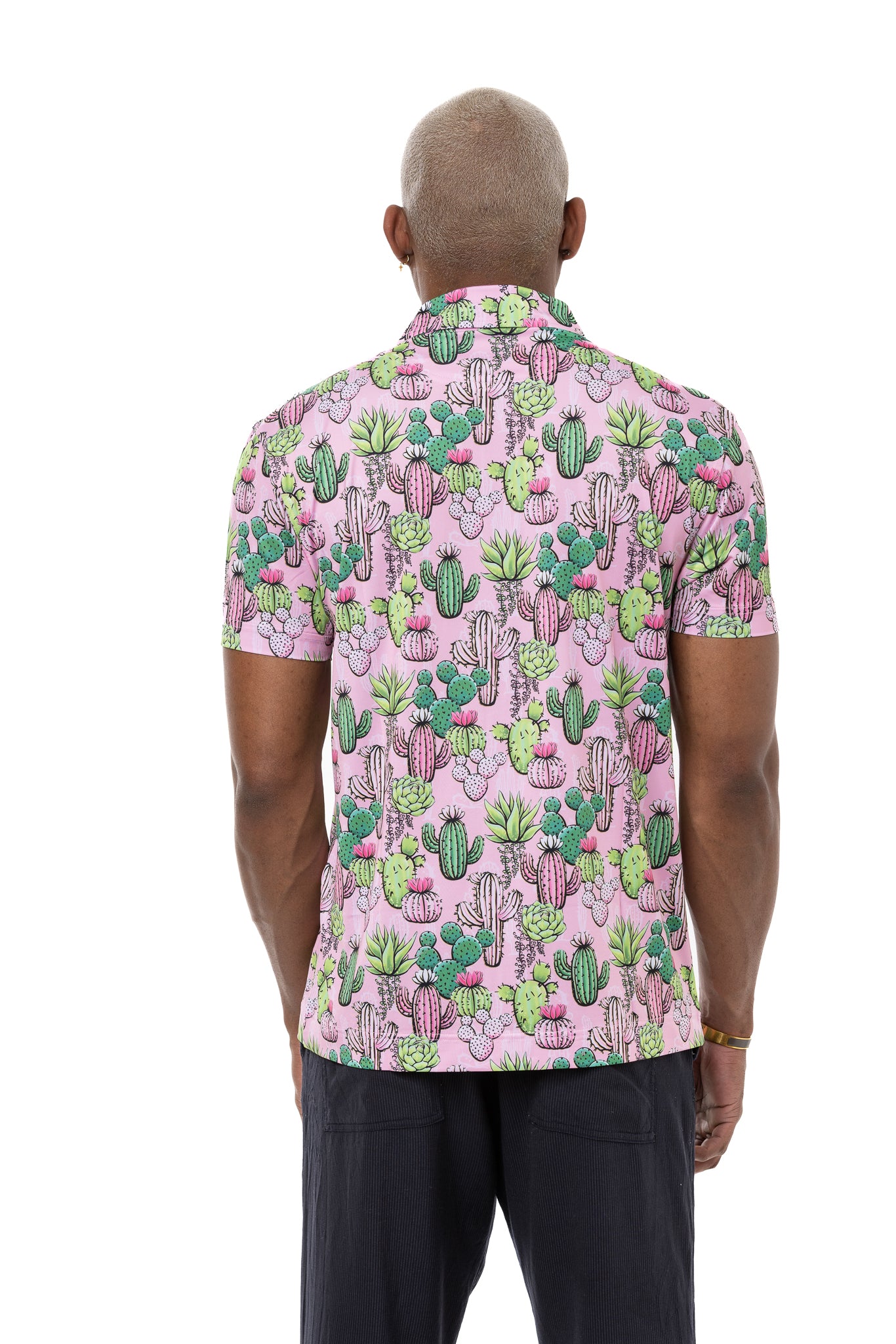 The Birdie Monster Cactus Frenzy Golf Polo is a bold and stylish option for golfers. Made from polyester and spandex, this shirt is both comfortable and durable. The quick-drying technology makes it ideal for hot weather, and the full range of motion allows for easy movement on the course. The multicolored cactus design on the pink background adds a pop of excitement to your golf attire. With a three-button placket, collared neckline, and tailored cut, this golf polo is both functional and fashionable.