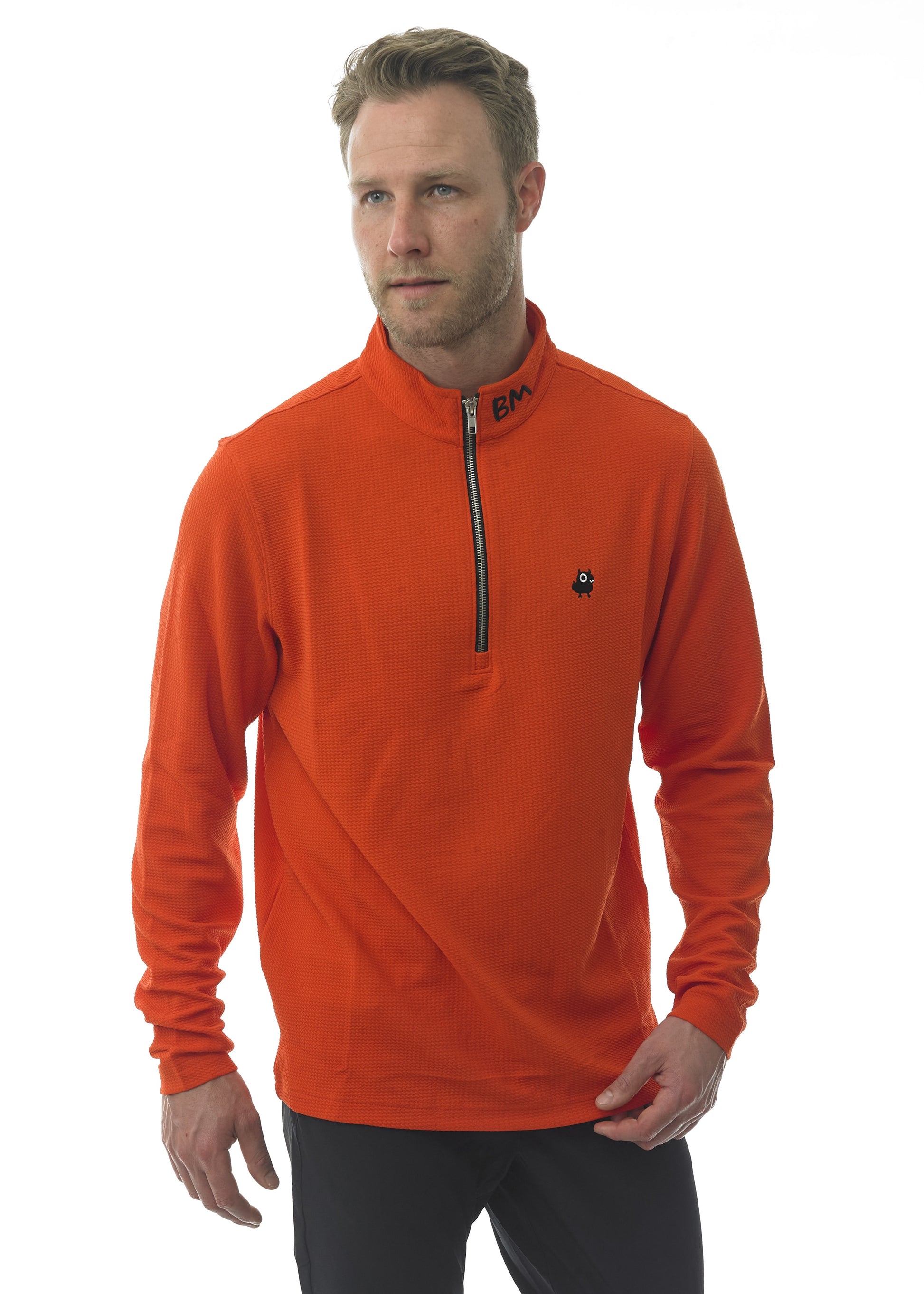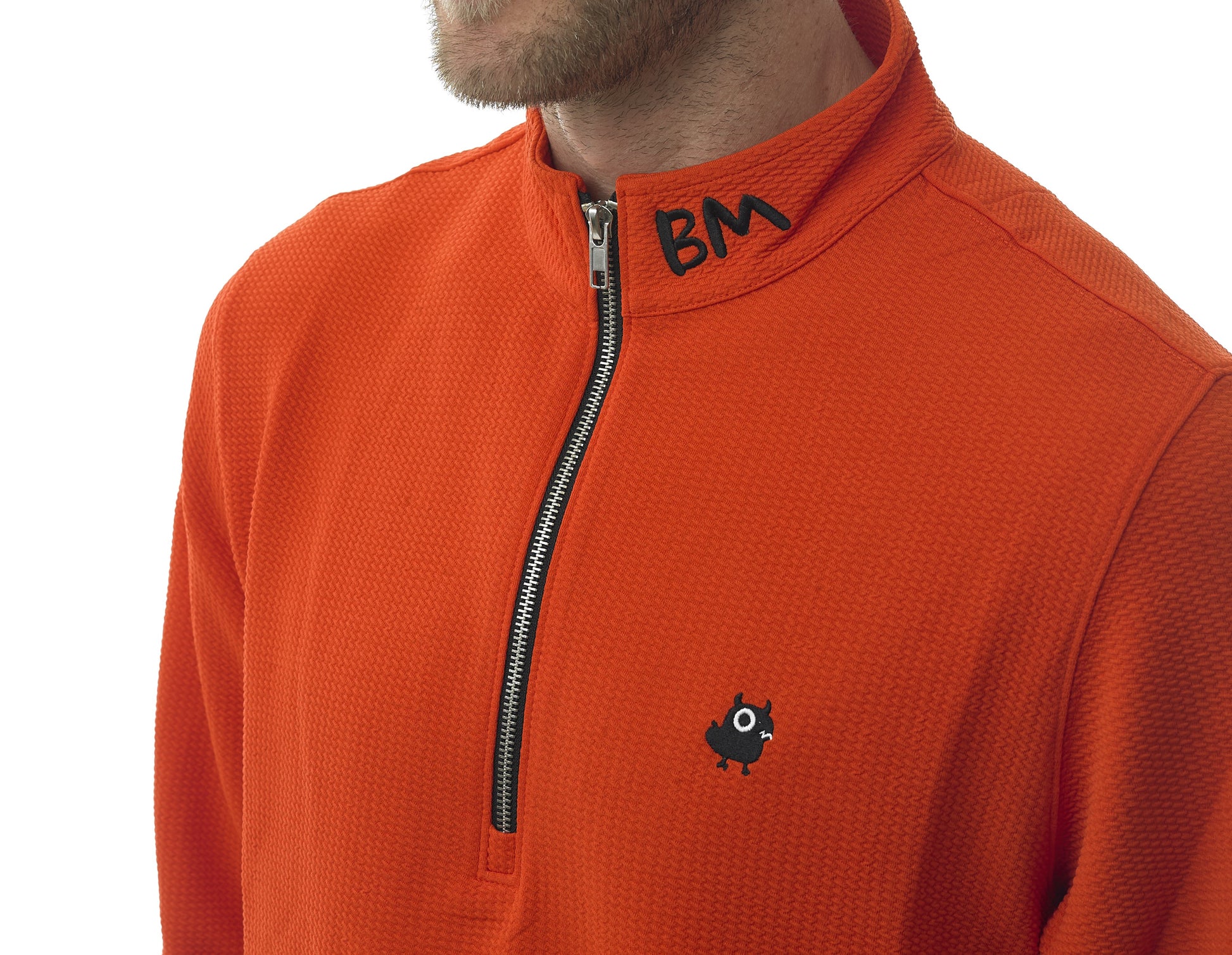 Introducing the Sunset Drive Quarter-Zip Pullover—a vibrant orange piece designed to turn heads. Featuring the iconic Birdie Monster logo proudly displayed on the chest and an embossed BM on the collar, this pullover combines bold style with our signature flair. Perfect for those who want to stand out both on and off the course.